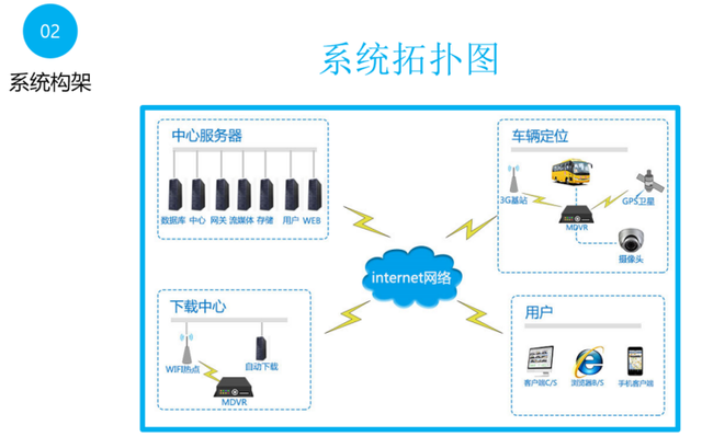 整個系統包含前端車載監控系統、4G無線通信線路、監控平臺。
